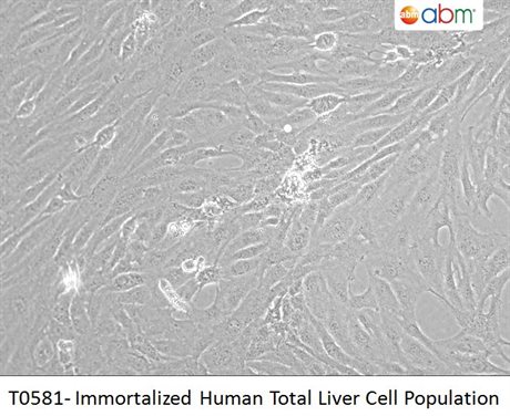 Immortalization Method: Serial passaging and transduction with recombinant lentiviruses carrying SV40 Large T antigenBioSafety Level: IISpecies: HumanSource Organ: LiverGrowth Properties: Adherent with some suspension cellsMorphology: OtherPopulation Doubling: 48 - 55 hoursSeeding Density: 30,000-40,000 cells/cm²; Recommend split ratio is 1:2 to 1:3Markers: N/ADonor Age: N/ADonor Gender: N/ADonor Ethnicity: N/APropagation: The base medium for this cell line is Prigrow III medium available at abm, Cat. No. TM003. To make the complete growth medium, add the following components to the base medium: fetal bovine serum (TM999)* to a final concentration of 10% and Penicillin/Streptomycin Solution (G255) to a final concentration of 1%. This cell line needs to be cultured in collagen coated flasks. Carbon dioxide (CO2): 5%, Temperature: +37.0°C. * abm does not recommend to use heat-inactivated FBS for cell culture unless specified otherwise.Quality Control: Real Time PCR was used to quantify the transgene expression.Shipping Condition: Dry IceStorage Condition: liquid nitrogen or -180°C